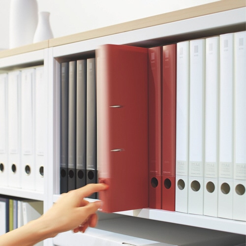 ●オフィスにマッチするスタイリッシュなカラー、背幅がスリムなオフホワイトのリングファイル(スリムリング)。A4タテ・背幅27mmです。