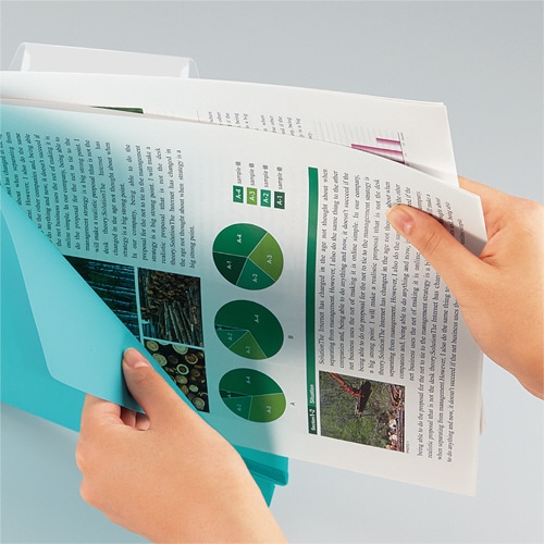 ●書類が閲覧しやすく、かつ立てて保管しても書類がこぼれ出さない特殊な3方袋とじ形状。