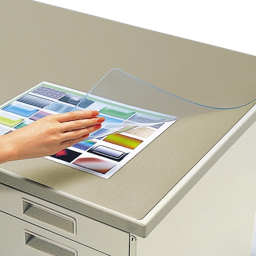 環境に配慮した再生オレフィン系樹脂使用のデスクマット。挟んだ書類が見やすい透明タイプ。グレーの下敷き付。