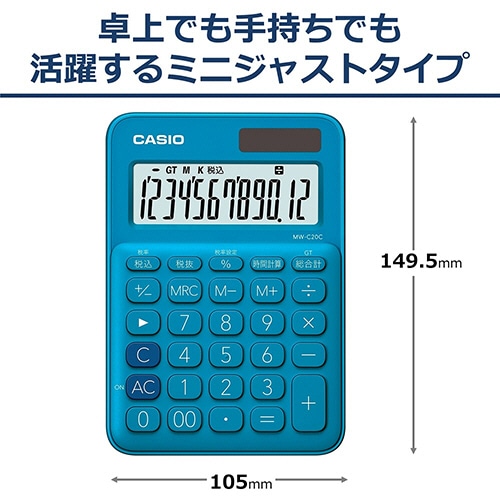 カシオ カラフル電卓 12桁 ミニジャストタイプ レイクブルー MW-C20C-BU-N 1台