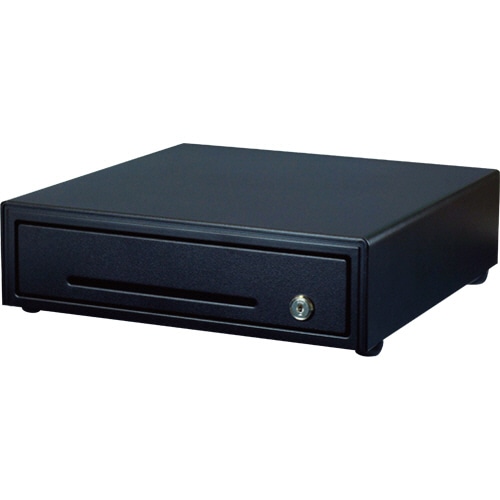 ●手動開閉式キャッシュドロア、本体色はブラックです。