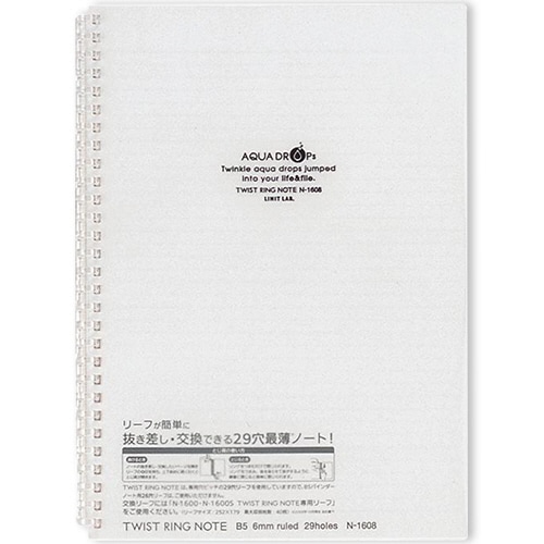 リヒトラブ AQUA DROPs ツイストノート セミB5 29穴 B罫 リーフ30枚付属 乳白 N-1608-1 1冊