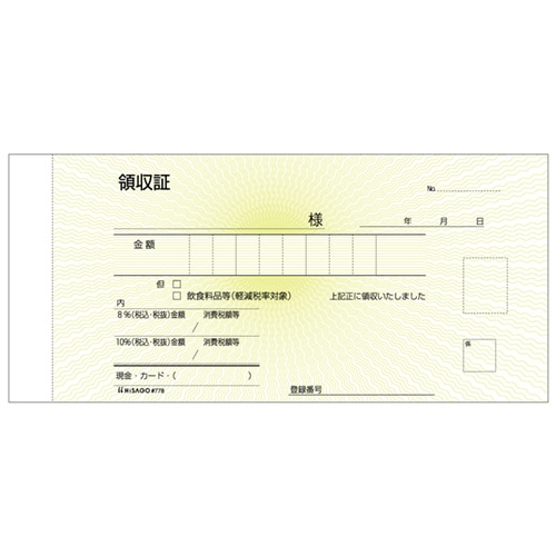 | 商品仕様 | ●サイズ/小切手サイズ ●寸法/タテ85×ヨコ185mm ●伝票タイプ/複写式 ●複写枚数/2枚 ●カーボン/ノーカーボン複写 ●消費税欄/有 ●その他仕様/●刷色:黒 ●複写内訳:(1枚目)領収証、(2枚目)領収証 ※2枚目は厚紙を使用しています。 ●ミシン目切り離し後のサイズ(小切手サイズ):85×170mm ●備考/※収入印紙欄あり |