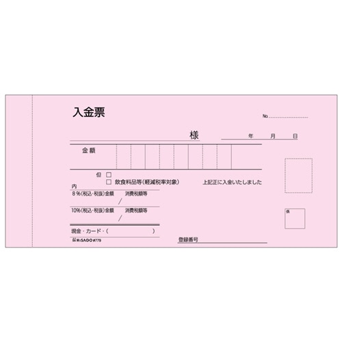 商品仕様 | ●サイズ/小切手サイズ ●寸法/タテ85×ヨコ185mm ●伝票タイプ/複写式 ●複写枚数/3枚 ●カーボン/ノーカーボン複写 ●消費税欄/有 ●その他仕様/●刷色:黒 ●複写内訳:(1枚目)領収証、(2枚目)入金票、(3枚目)領収証 ※3枚目は厚紙を使用しています。 ●ミシン目切り離し後のサイズ(小切手サイズ):85×170mm ●備考/※収入印紙欄あり ※2019年10月1日から施行される軽減税率制度対応商品を順次出荷しております。新仕様・旧仕様のご指定は承っておりません。 |