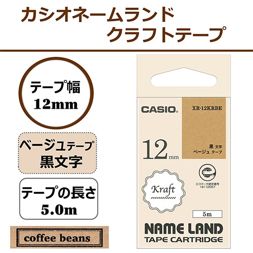 カシオ NAME LAND クラフトテープ 12mm×5m ベージュ/黒文字 XR-12KRBE 1個