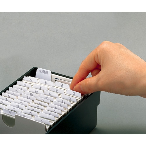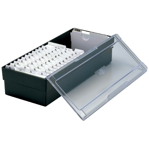 商品仕様 | ●サイズ/名刺 ●収容枚数/700枚 ●色/クリアブルー ●寸法/W103×D259×H71mm ●材質/本体:ポリスチレン(半透明)、カード材質:紙、フタ:ポリスチレン ●付属品/見出しカード48枚(「あいうえお」別の個別見出しカード×44枚、「未整理」の見出しカード×1枚、無地の見出しカード×3枚)、仕切り板×2枚 |