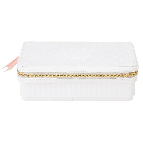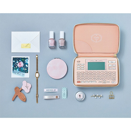 ●縫製カバーと本体が一体化されたコスメポーチのようなデザイン、本体色はコーラルピンクの「テプラ」PRO SR-GL2です。手触りや質感にもこだわり、落ち着いた大人の雰囲気を持たせました。