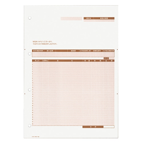 | 商品仕様 | ●様式/合計請求明細書 ●用紙タイプ/カット紙 ●サイズ/A4 ●寸法/297×210mm ●面付/1面 ●刷色/茶 ●とじ穴/4穴 ●とじ穴間隔/80mm ●白色度/82%程度 ●重量/4g ●備考/※郵送される場合は市販の長形3号、洋形4号などの適正サイズの封筒をご使用ください。 ※市販の窓あき封筒には対応しておりません。 ※白色度はISO白色度 |