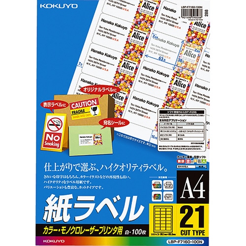 コクヨ カラーレーザー&カラーコピー用 紙ラベル A4 21面 38.1×63.5mm LBP-F7160-100N 1冊(100シート)