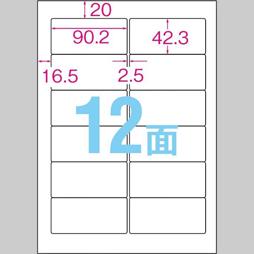 商品仕様 | ●サイズ/A4 ●シートサイズ/210×297mm ●ラベルサイズ/42.3×90.2mm ●面付け/12面 ●カット内容/2列×6段 ●紙質/上質紙 ●総厚み/約0.135mm ●白色度/約84% ●紙色/白無地 ●備考/※厚紙モード、手差し給紙でお使いください。また、お使いの機種によっては対応しない場合がございます。 ※インクジェットプリンタの場合、にじみが生じる場合がございます。 |