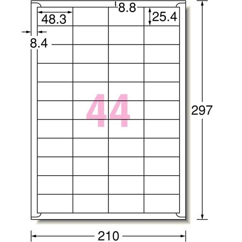 商品仕様 | ●サイズ/A4 ●シートサイズ/210×297mm ●ラベルサイズ/25.4×48.3mm ●面付け/44面 ●カット内容/四辺余白付 ●紙質/上質紙 ●坪量/125g/m2 ●ラベルの厚み/0.08mm ●総厚み/0.15mm ●白色度/89% ●紙色/ホワイト ●重量/780g ●再剥離/○ ●その他仕様/●手書き対応 ●備考/※厚紙モード、手差し給紙でお使いください。 ※お使いの機種によっては対応しない場合がございます。 |