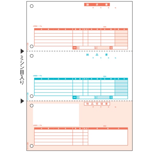 | 商品仕様 | ●様式/納品書 ●用紙タイプ/カット紙 ●サイズ/A4 ●寸法/210×297mm ●ミシン目切り離し後サイズ/210×99mm ●面付/3面 ●とじ穴/2穴 ●坪量/70g/m2 ●厚み/0.09mm ●白色度/80% ●備考/※2021年12月頃より順次、原紙の変更に伴い白色度が約78%→約80%に変更になります。 |