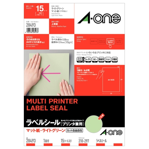 エーワン ラベルシール[プリンタ兼用] マット紙・ライトグリーン A4判 ノーカット 28493 1冊(15シート)