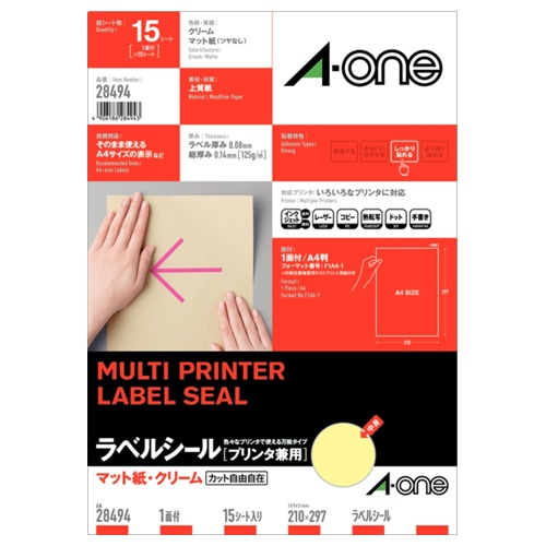 エーワン ラベルシール[プリンタ兼用] マット紙・クリーム A4判 ノーカット 28494 1冊(15シート)