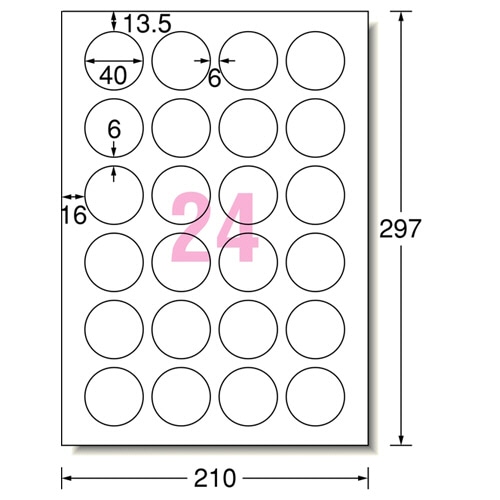 | 商品仕様 | ●サイズ/A4 ●シートサイズ/210×297mm ●ラベルサイズ/40×40mm ●面付け/24面 ●カット内容/丸形 ●坪量/165g/m2 ●ラベルの厚み/0.12mm ●総厚み/0.18mm ●白色度/84% ●紙色/ホワイト ●重量/139g |