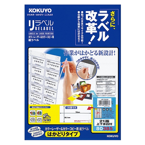 コクヨ カラーレーザー&カラーコピー用 紙ラベル(リラベル)(はかどりタイプ) A4 21面上下余白付 38.1×70mm LBP-E80385 1冊(20シー
