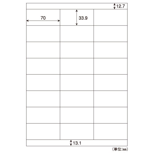 | 商品仕様 | ●サイズ/A4 ●シートサイズ/210×297mm ●ラベルサイズ/33.9×70mm ●面付け/24面 ●カット内容/上下余白 ●坪量/117g/m2 ●ラベルの厚み/0.07mm ●総厚み/約0.12mm ●紙色/白 ●備考/※モノクロコピー、モノクロレーザー、カラーコピー、カラーレーザーでは、厚紙モード・手差し給紙でお使いください。お使いの機種によっては対応しない場合がございます。 ※インクジェットでは、にじみが生じる場合がございます。 |