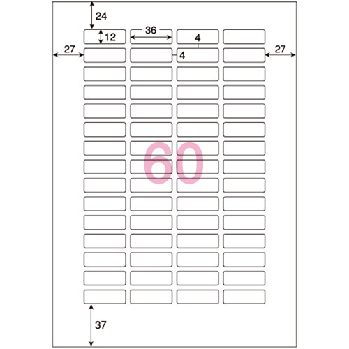 | 商品仕様 | ●サイズ/A4 ●シートサイズ/210×297mm ●ラベルサイズ/12×36mm ●面付け/60面 ●紙質/上質紙 ●坪量/117g/m2 ●ラベルの厚み/0.07mm ●総厚み/0.124mm ●紙色/白 ●備考/※ラベルを印刷する際は「ラベル」あるいは「厚紙」設定でお使いください。給紙方法や設定等はそれぞれのプリンタマニュアルでご確認ください。 ※インクジェットプリンタで印刷の際は、普通紙設定で印刷してください。本製品には耐水性はありません。 ※剥離紙(台紙)は樹脂ラミネート加工がされていないので、そのままリサイクルが加工です。 ※メーカーホームページより印刷用ソフト「ヒサゴ工房」を無料でダウンロードできます。 ※お使いの機種によっては対応しない場合がございます。 |