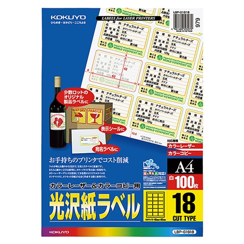 コクヨ カラーレーザー&カラーコピー用光沢紙ラベル A4 18面 42×62mm LBP-G1918 1冊(100シート)