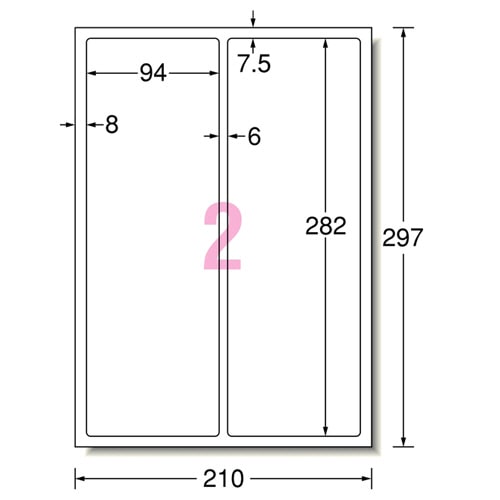 商品仕様 | ●サイズ/A4 ●シートサイズ/210×297mm ●ラベルサイズ/94×282mm ●面付け/2面 ●紙質/ポリエステルフィルム+レーザー専用塗工 ●ラベルの厚み/0.08mm ●総厚み/0.16mm ●紙色/ホワイト ●重量/100g ●水に強い/○ ●強粘着/○ ●屋外用/○ |