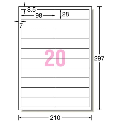 商品仕様 | ●サイズ/A4 ●シートサイズ/210×297mm ●ラベルサイズ/28×98mm ●面付け/20面 ●紙質/ポリエステルフィルム+レーザー専用塗工 ●ラベルの厚み/0.08mm ●総厚み/0.16mm ●紙色/ホワイト ●重量/100g ●水に強い/○ ●強粘着/○ ●屋外用/○ ●備考/※厚紙モード、手差し給紙でお使いください。お使いの機種によっては対応しない場合がございます。 |
