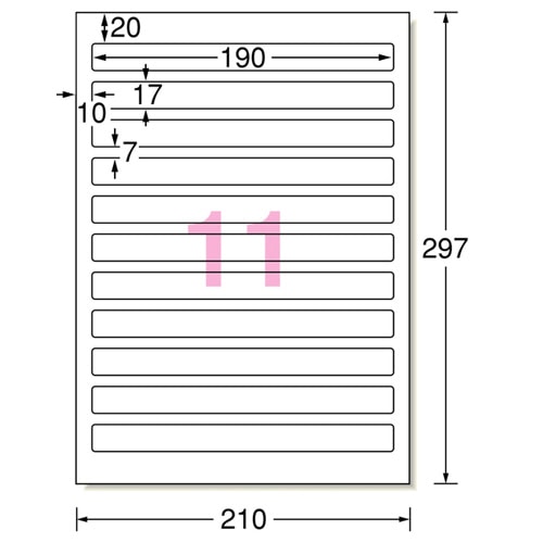 | 商品仕様 | ●サイズ/A4 ●シートサイズ/210×297mm ●ラベルサイズ/17×190mm ●面付け/11面 ●紙質/上質紙 ●坪量/120g/m2 ●ラベルの厚み/0.07mm ●総厚み/0.13mm ●白色度/81% ●紙色/ホワイト ●重量/188g ●備考/※厚紙モード、手差し給紙でお使いください。 ※お使いの機種によっては対応しない場合がございます。 |