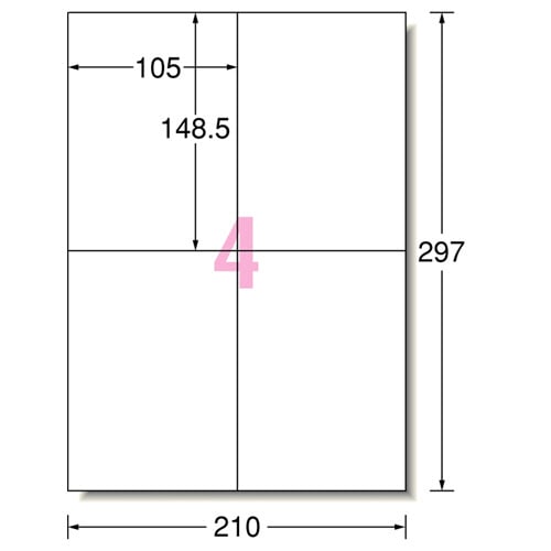 | 商品仕様 | ●サイズ/A4 ●シートサイズ/210×297mm ●ラベルサイズ/105×148.5mm ●面付け/4面 ●紙質/上質紙 ●坪量/140g/m2 ●ラベルの厚み/0.095mm ●総厚み/0.15mm ●白色度/98% ●紙色/ホワイト ●重量/3940g ●備考/※厚紙モード、手差し給紙でお使いください。 ※お使いの機種によっては対応しない場合がございます。 |
