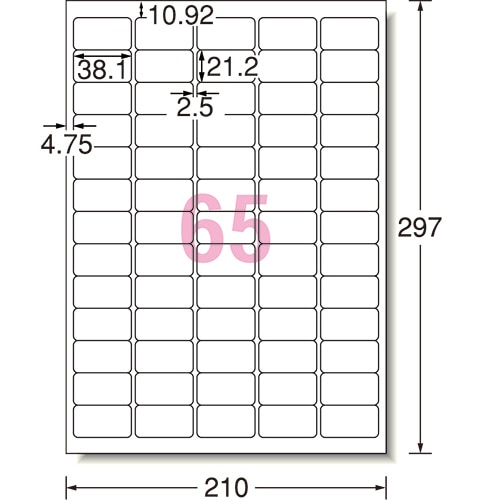 | 商品仕様 | ●サイズ/A4 ●シートサイズ/210×297mm ●ラベルサイズ/21.2×38.1mm ●面付け/65面 ●カット内容/四辺余白(角丸) ●紙質/ポリエステルフィルム ●総厚み/0.15mm ●紙色/ホワイト ●水に強い/○ ●備考/※顔料インクには非対応です。 |