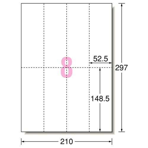 商品仕様 | ●サイズ/A4 ●シートサイズ/210×297mm ●カードサイズ/52.5×148.5mm ●面付け/8面 ●紙質/上質紙 ●紙色/ホワイト ●坪量/105g/m2 ●総厚み/0.12mm ●重量/150g |