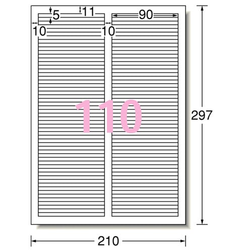 商品仕様 | ●サイズ/A4 ●シートサイズ/210×297mm ●ラベルサイズ/5×90mm ●面付け/110面 ●紙質/上質紙 ●坪量/160g/m2 ●ラベルの厚み/0.11mm ●総厚み/0.17mm ●白色度/86% ●紙色/ホワイト ●重量/160g ●下地が隠せる/○ |