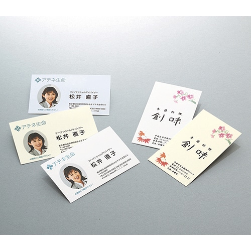 | 商品仕様 | ●サイズ/名刺サイズ ●シートサイズ/55×91mm ●カードサイズ/55×91mm ●面付け/1面 ●紙質/マット紙 ●紙色/ナチュラルホワイト ●坪量/210g/m2 ●カードの厚み/0.24mm ●白色度/約88% ●重量/1g |