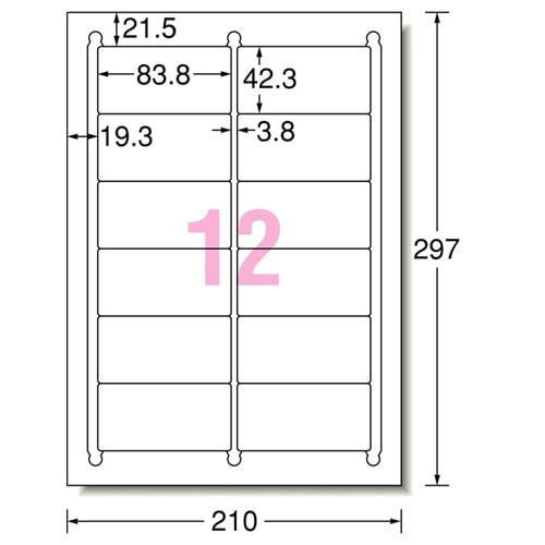 商品仕様 | ●サイズ/A4 ●シートサイズ/210×297mm ●ラベルサイズ/42.3×83.8mm ●面付け/12面 ●紙質/上質紙 ●坪量/120g/m2 ●ラベルの厚み/0.07mm ●総厚み/0.13mm ●白色度/81% ●紙色/ホワイト ●重量/815g ●備考/※厚紙モード、手差し給紙でお使いください。 ※お使いの機種によっては対応しない場合がございます。 |