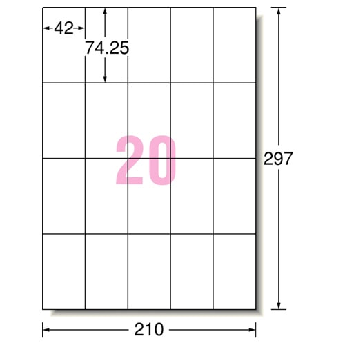 商品仕様 | ●サイズ/A4 ●シートサイズ/210×297mm ●ラベルサイズ/42×74.25mm ●面付け/20面 ●紙質/上質紙 ●坪量/120g/m2 ●ラベルの厚み/0.07mm ●総厚み/0.13mm ●白色度/81% ●紙色/ホワイト ●重量/780g ●備考/※厚紙モード、手差し給紙でお使いください。 ※お使いの機種によっては対応しない場合がございます。 |