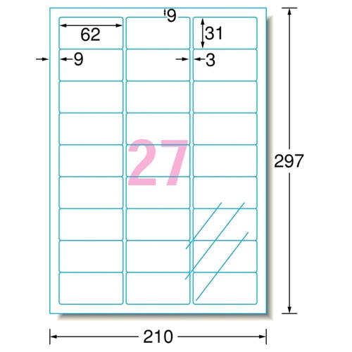 商品仕様 | ●サイズ/A4 ●シートサイズ/210×297mm ●ラベルサイズ/31×62mm ●面付け/27面 ●紙質/ポリエステルフィルム+レーザー専用塗工 ●ラベルの厚み/0.07mm ●総厚み/0.15mm ●紙色/透明 ●重量/155g ●備考/※厚紙モード、手差し給紙でお使いください。 ※お使いの機種によっては対応しない場合がございます。 |