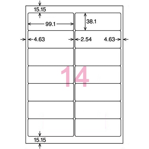 商品仕様 | ●サイズ/A4 ●シートサイズ/210×297mm ●ラベルサイズ/38.1×99.1mm ●面付け/14面 ●坪量/134g/m2 ●ラベルの厚み/0.07mm ●総厚み/0.14mm ●白色度/85%程度(ISO) ●古紙パルプ配合率/70% ●紙色/白無地 ●備考/※厚紙モード、手差し給紙でお使いください。また、お使いの機種によっては対応しない場合がございます。 |