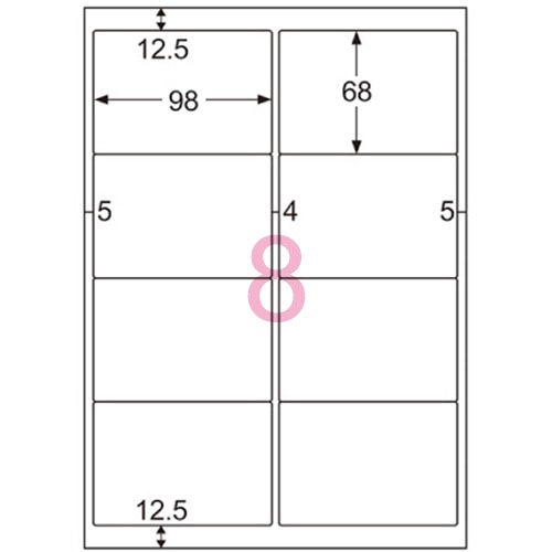 商品仕様 | ●サイズ/A4 ●シートサイズ/210×297mm ●ラベルサイズ/68×98mm ●面付け/8面 ●カット内容/2列×4段 ●紙質/上質紙 ●坪量/144g/m2 ●ラベルの厚み/約0.10mm ●総厚み/0.15mm ●白色度/約120% ●紙色/白無地 ●その他仕様/●片数:800片入 ●備考/※レーザープリンタ・コピー機によっては(特に「厚紙」設定がない機種では、トナーが定着しにくい場合があります。塗りつぶし面積が大きい場合、ムラが出ることがあります。 ※厚紙モード、手差し給紙でお使いください。また、お使いの機種によっては対応しない場合がございます。 ※インクジェットプリンタの場合、にじみが生じる場合がございます。 |