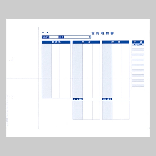 商品仕様 | ●様式/支給明細書 ●用紙タイプ/単票 ●サイズ/A4ヨコ ●寸法/297×210mm ●ミシン目切り離し後サイズ/229×mm ●面付/1面 ●刷色/コバルトブルー ●対応ソフト/給与奉行V ERP8、給与奉行V ERP ●備考/※5108:単票封筒用明細書(内訳項目付)の後継商品 ※適合封筒:FT-1S、FT-2S |