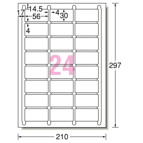 商品仕様 | ●サイズ/A4 ●シートサイズ/210×297mm ●ラベルサイズ/30×56mm ●面付け/24面 ●紙質/上質紙 ●坪量/120g/m2 ●ラベルの厚み/0.07mm ●総厚み/0.13mm ●白色度/81% ●紙色/ホワイト ●重量/210g ●備考/※厚紙モード、手差し給紙でお使いください。 ※お使いの機種によっては対応しない場合がございます。 |