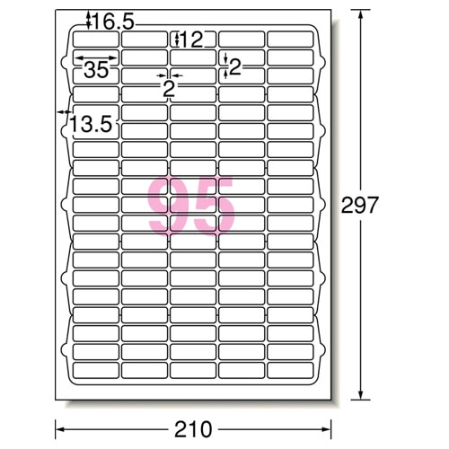 商品仕様 | ●サイズ/A4 ●シートサイズ/210×297mm ●ラベルサイズ/12×35mm ●面付け/95面 ●カット内容/四辺余白付(角丸) ●坪量/120g/m2 ●ラベルの厚み/0.07mm ●総厚み/0.13mm ●白色度/81% ●紙色/ホワイト ●重量/780g ●備考/※厚紙モード、手差し給紙でお使いください。 ※お使いの機種によっては対応しない場合がございます。 |