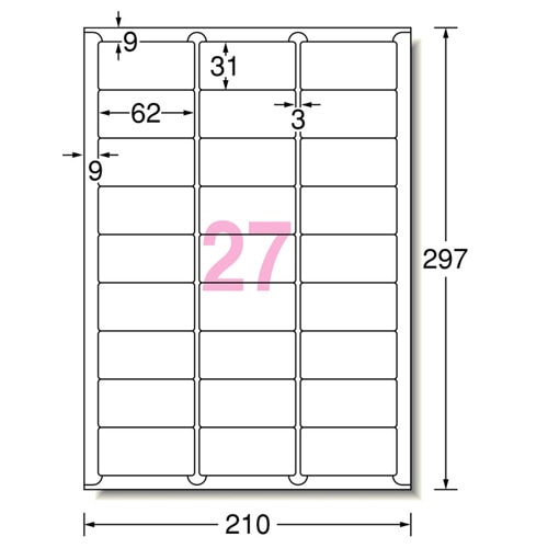 | 商品仕様 | ●サイズ/A4 ●シートサイズ/210×297mm ●ラベルサイズ/31×62mm ●面付け/27面 ●紙質/上質紙 ●坪量/120g/m2 ●ラベルの厚み/0.07mm ●総厚み/0.13mm ●白色度/81% ●紙色/ホワイト ●重量/780g ●備考/※厚紙モード、手差し給紙でお使いください。 ※お使いの機種によっては対応しない場合がございます。 |
