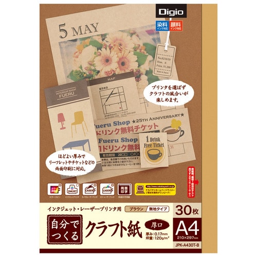 ナカバヤシ インクジェット・レーザープリンタ用 自分でつくるクラフト紙 A4 厚口 ブラウン JPK-A430T-B 1冊(30枚)