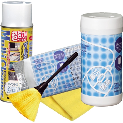 | 商品仕様 | ●仕様/●セット内容:マルチフォームクリーナー、OAウェットティッシュ(70枚)、ウェットティッシュ詰め替え用100枚入り、化学ダスター、静電吸着ダスター 【マルチクリーナー】 ●内容量:420ml ●仕様:エアゾ-ル式スプレー 【OAウェットティッシュ】 ●内容量:(ボトル入り)70枚、(詰め替え用)100枚 ●基布サイズ:W200×H140mm ●材質:不織布、水、エタノール、除菌剤、帯電防止剤、界面活性剤、防腐剤 【化学ダスター】 ●サイズ:W310×D3×H390mm ●材質:綿100%(静電美化剤入り) 【静電吸着ダスター】 ●サイズ:W40×D40×H280mm ●材質:PP ●備考/※液晶画面、ディスプレイ画面やフィルターにはご使用できません。 |