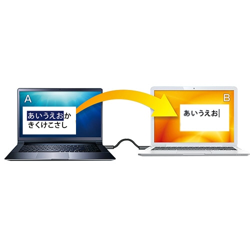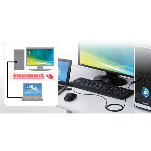 ●2台のパソコンをこのケーブルでつなぐだけで、パソコン間をマウスカーソルが行き来できる。