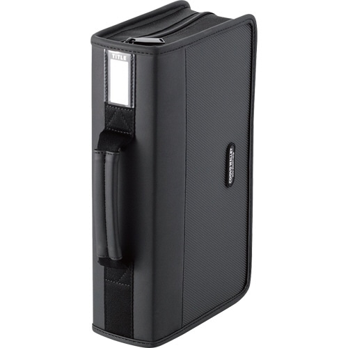 商品仕様 | ●寸法/W295×D80×H175mm ●色/ブラック ●材質/本体:PP・PVC、ディスク収納部:PP不織布・PPフィルム ●収納枚数/96枚 ●その他仕様/●重量:340g ●付属品/タイトルカード×2枚 ●備考/※サイズはハンドル含まず メーカーHPはこちら |