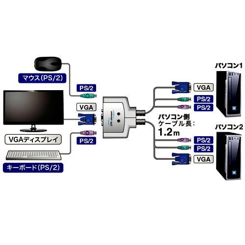 1組のPS/2キーボード・PS/2マウス・ディスプレイで2台のパソコンを切り替えて使用できます。