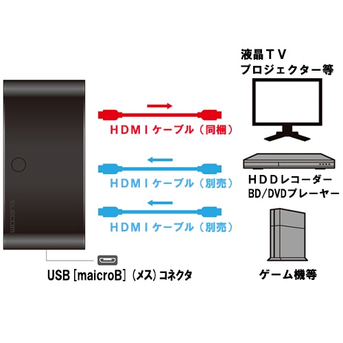 ●HDMI機器から電力を供給するため、ACアダプタなど外部電源を必要とせずに利用可能です。HDMI機器からの電源供給が少ない場合でも、安定動作ができるようにするための外部電源ポート(microUSB端子)が搭載されています。(USBケーブル・ACアダプタは別売です。)