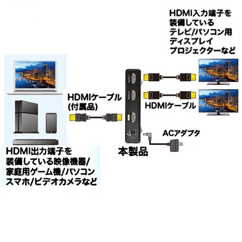 ●1台のHDMI機器の信号を高画質・高音質のまま2台のHDMI入力端子付き機器(ディスプレイ・プロジェクターなど)に同時に分配出力。