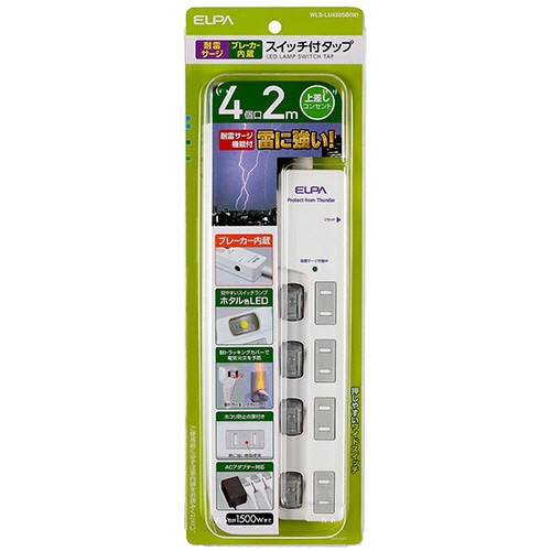 ELPA 耐雷サージ LEDスイッチ付タップ(ブレーカー付・上差し) 4個口 2m WLS-LU420SB(W) 1個