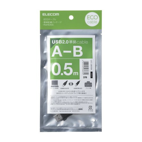 エレコム エコUSB2.0ケーブル A-Bタイプ ブラック 0.5m RoHS指令準拠(10物質) U2C-JB05BK 1本