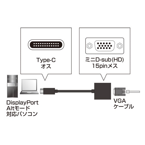 ●「Displayport Alternate Mode(ディスプレイポート オルタネートモード)」に準拠しているUSB Type-Cポートに接続し、VGAの映像信号に変換。